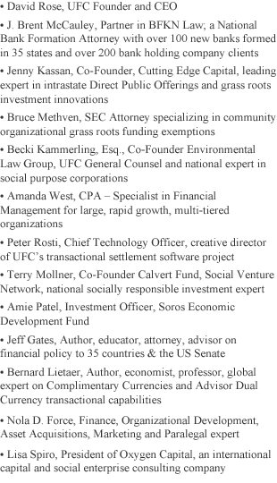 Unified Field Corporation (UFC) is a sustainable community partnership bank model and systems development company. We believe that the banking industry is one of the most powerful tools that we have for positive change to create sustainable, self-reliant and resilient communities. We believe in working diligently and sincerely together to create the prosperity we all envision.